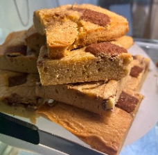A white chocolate fudgie blondie, filled with white chocolate chunks & hazelnut crème sauce, topped with pieces of Kinder Bueno bar.