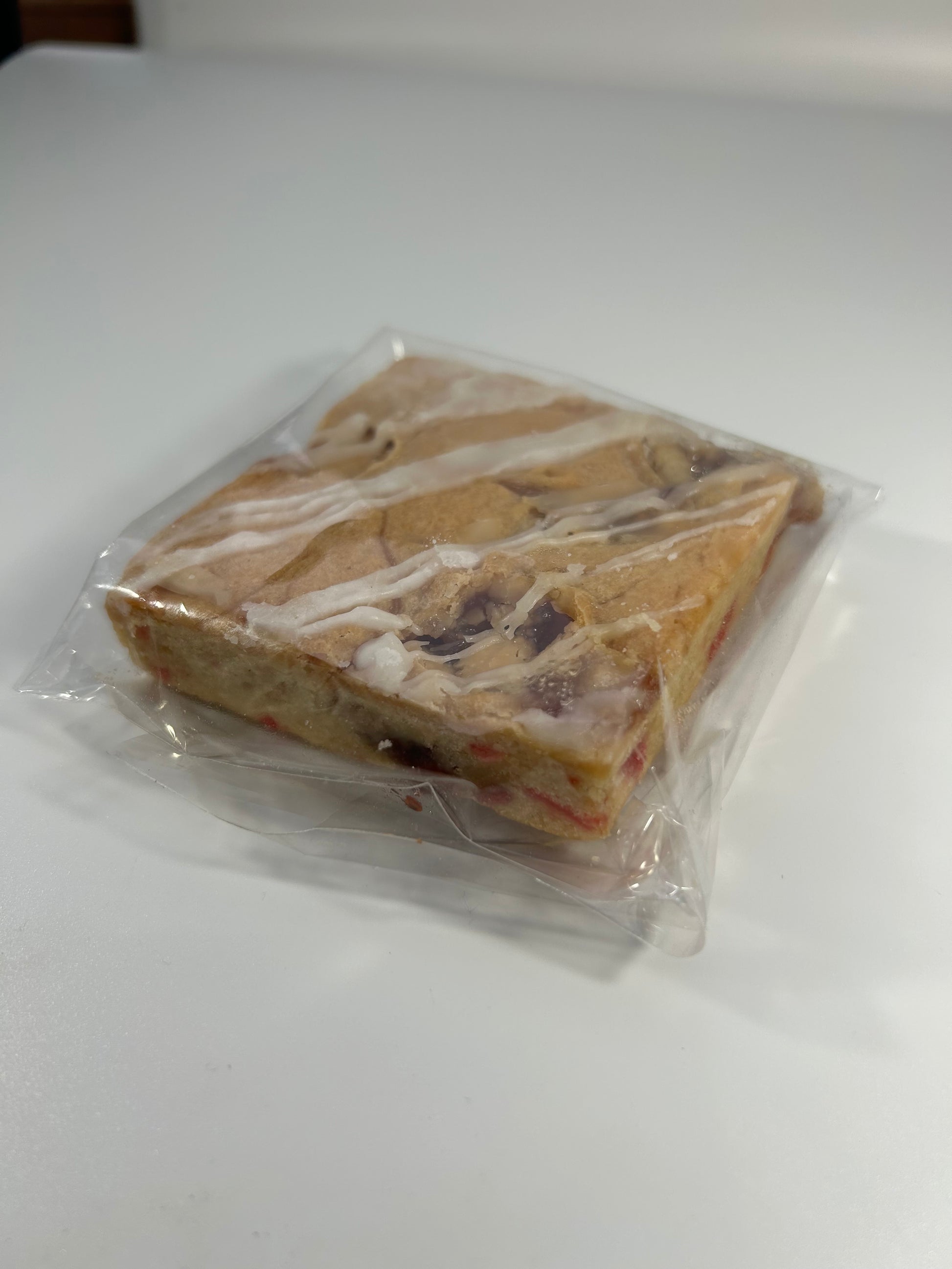 A white chocolate fudgie blondie, filled with white chocolate chunks, flaked almonds, glacé cherries & swirls of Raspberry Jam. Topped with flaked almonds & white fondant icing.