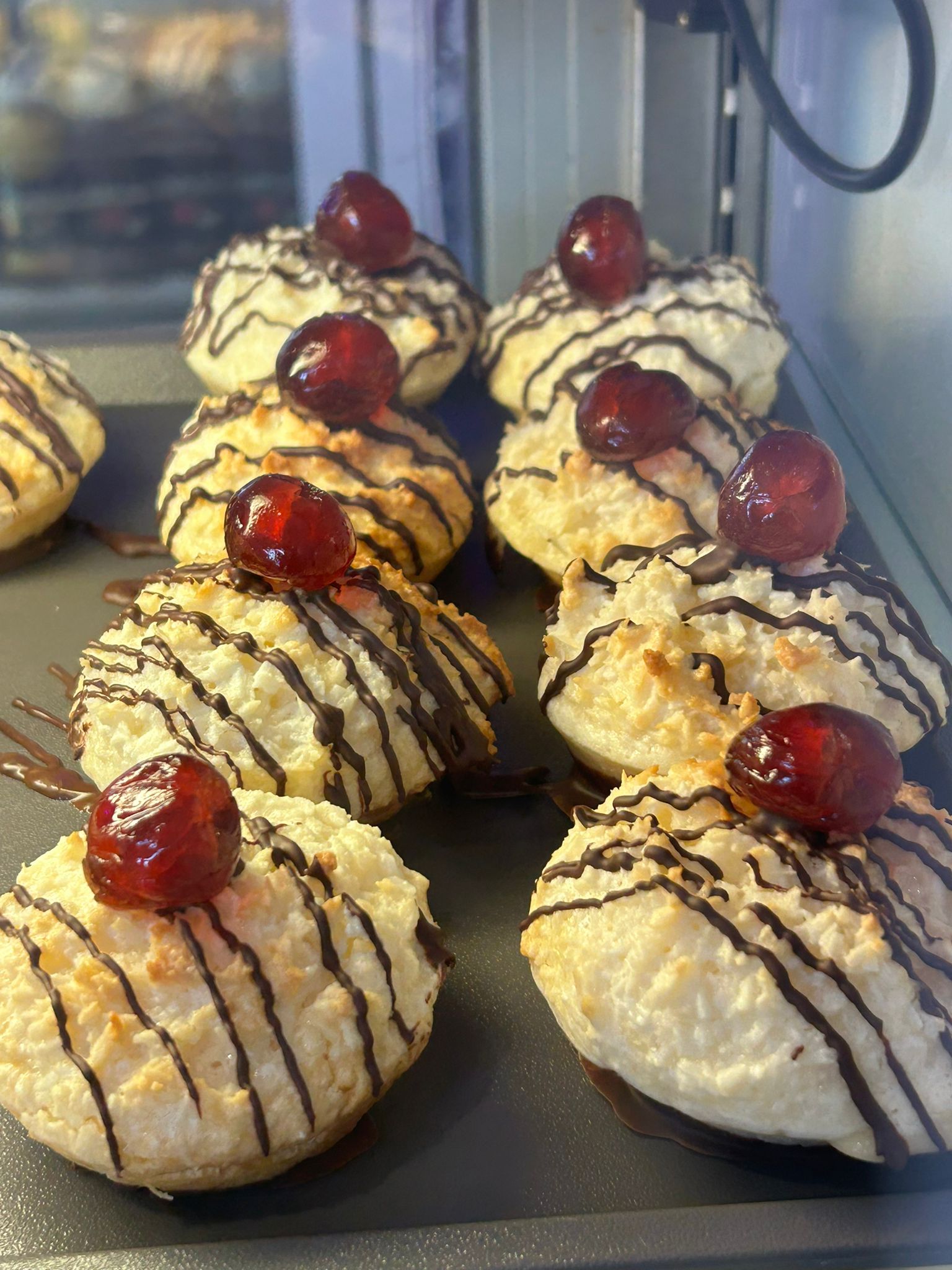 A super indulgent coconut treat. Desiccated coconut mixed with sticky sweet condensed milk, baked to the perfect consistency, drizzled with sweet milk chocolate & topped with a glacé cherry.