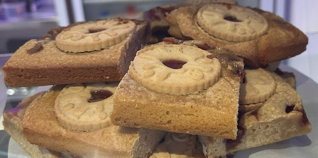 A white chocolate fudgie blondie, filled with white chocolate chunks & raspberry jam swirls, topped with a Jammy Dodger Biscuit