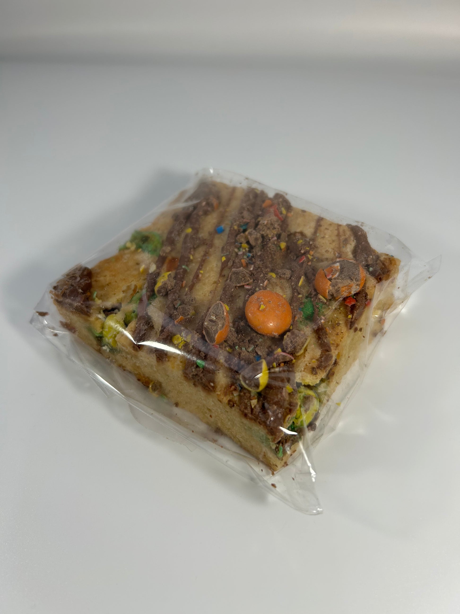 A white chocolate fudgie blondie, filled with milk chocolate M&Ms. Drizzled with milk chocolate.