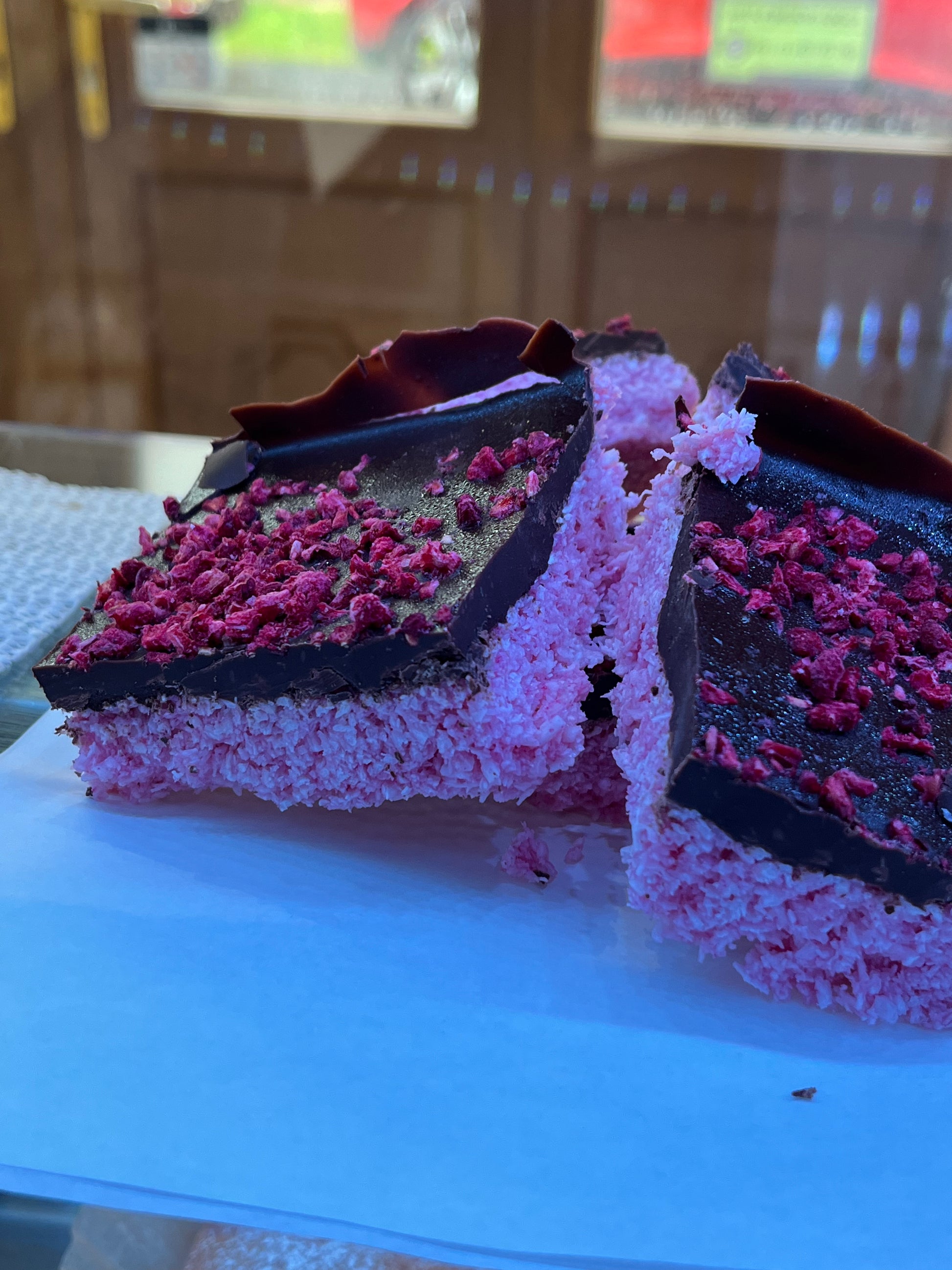 Inspired by one of our favourite sweets from the Sweet Counter. Our raspberry ruffle bar, combines desiccated coconut, condensed milk & raspberry flavour, topped with a dark chocolate and freeze dried raspberries. A real treat!
