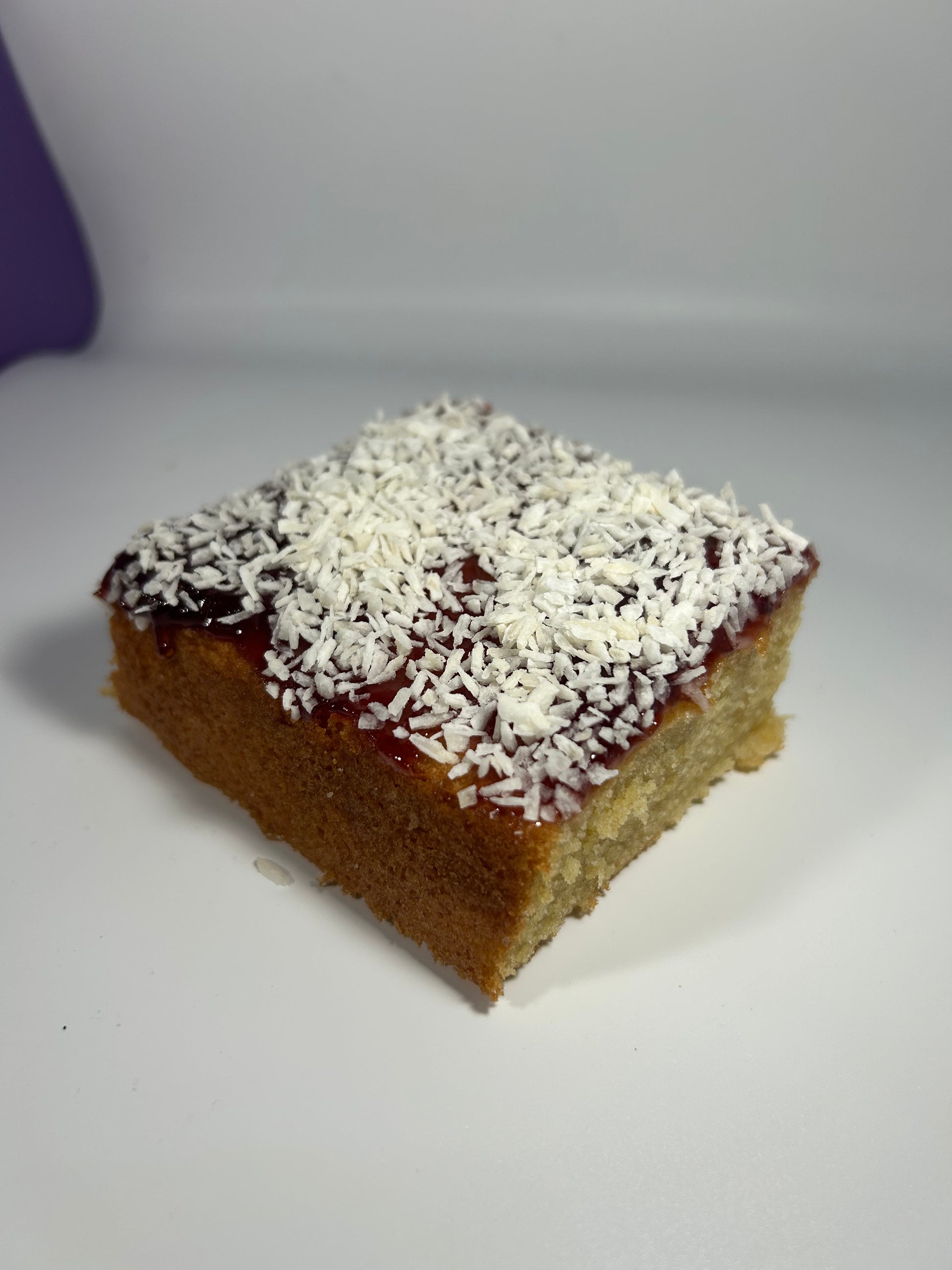 A generous slab of fluffy vanilla sponge, topped with a tangy fruit jam & desiccated coconut.